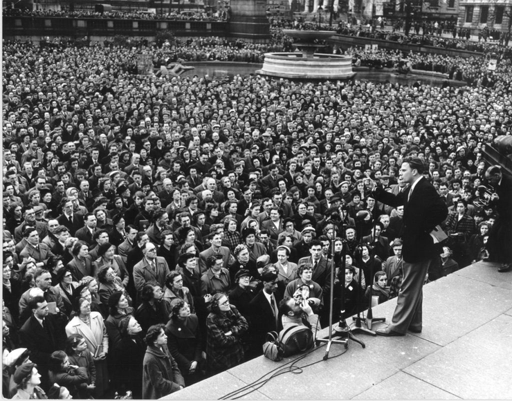 Graham’s Los Angeles Crusade in 1949 brought international recognition. Originally scheduled for three weeks, the meetings were extended to more than eight weeks. “In the city of Los Angeles, the largest tent ever erected for a revival meeting is now complete,” the news media reported at the time. The tent seated 6,500 people, and several thousand more stood around the sides.